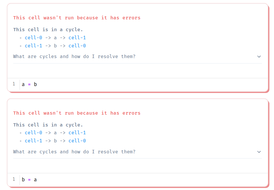 marimo parses your cells to understand the order in which they run: run a cell, and cells that refer to its defined variables need to run afterward. With a cycle, the execution order becomes ambiguous, while also introducing an infinite loop.